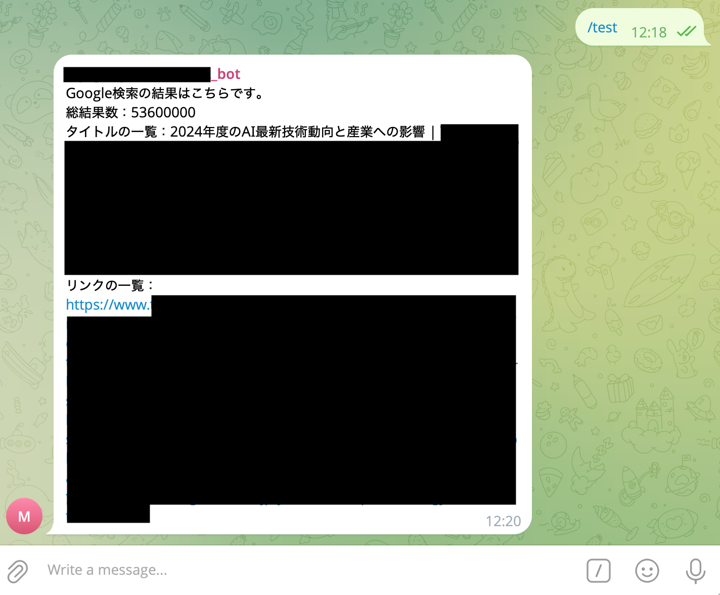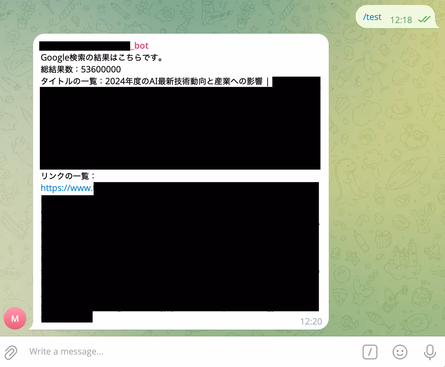 Telegramでメッセージを受信した際、その内容を検索キーワードとして自動でGoogle 検索を実行し、検索結果をTelegramに返信する連携です。