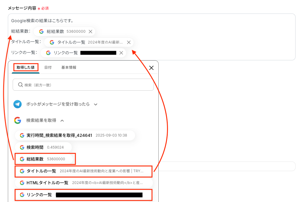 「メッセージ内容」は、取得した値から選択し、必要に応じて任意のテキストを手動で入力してください。