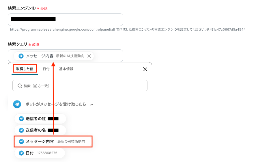 取得した値を使用することで、毎回最新の検索結果がTelegramへ通知されます。