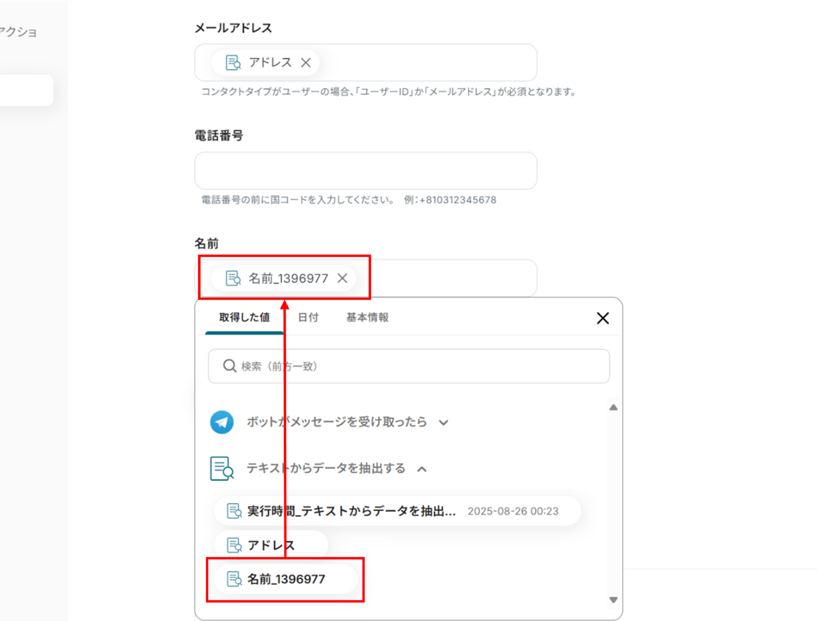 「取得した値」にTelegramの情報が反映されればテスト成功です。