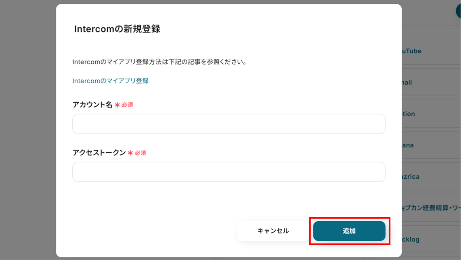 「Intercomの新規登録」画面から、アカウント名、アクセストークンを入力し「追加」をクリックします。