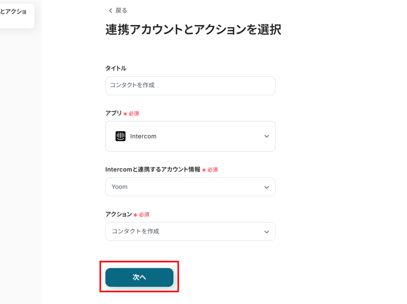(2)「連携アカウントとアクションを選択」画面から、Intercomと連携するアカウント情報に誤りがないかを確認し、アクションは「コンタクトを作成」のままで「次へ」をクリックします。