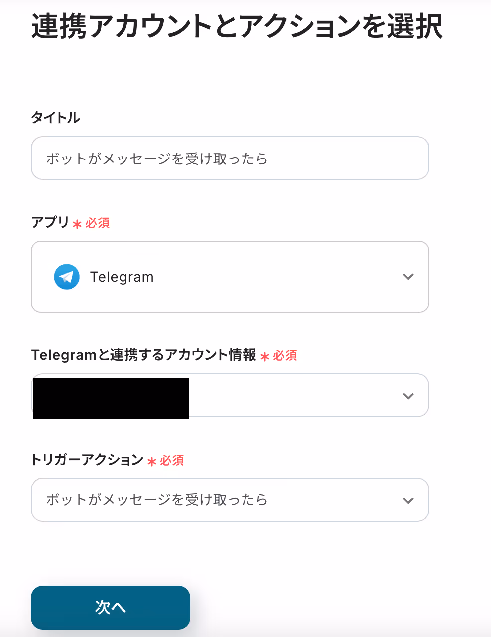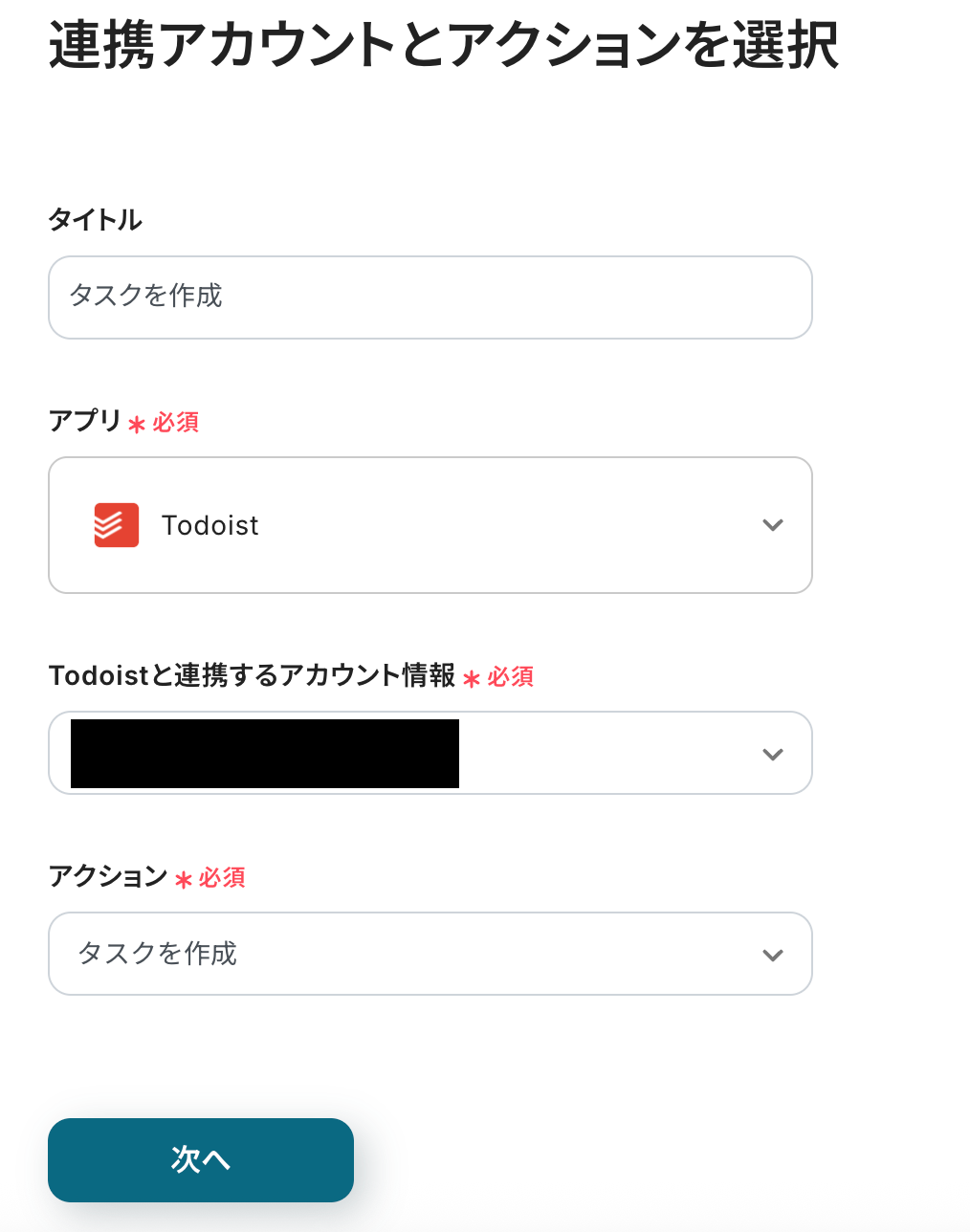 連携アカウントとアクションを選択する画面は、以下の内容を確認し、次へをクリックしましょう。