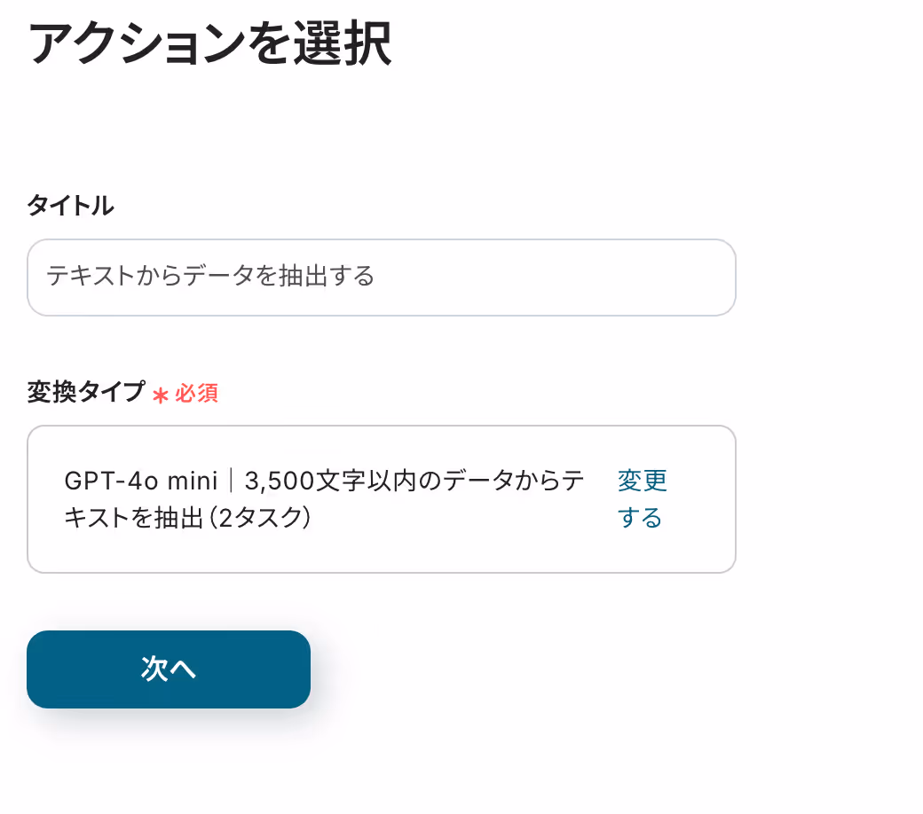 アクションは「GPT-4o mini|3,500文字以内のデータからテキストを抽出(2タスク)」が選択されています。