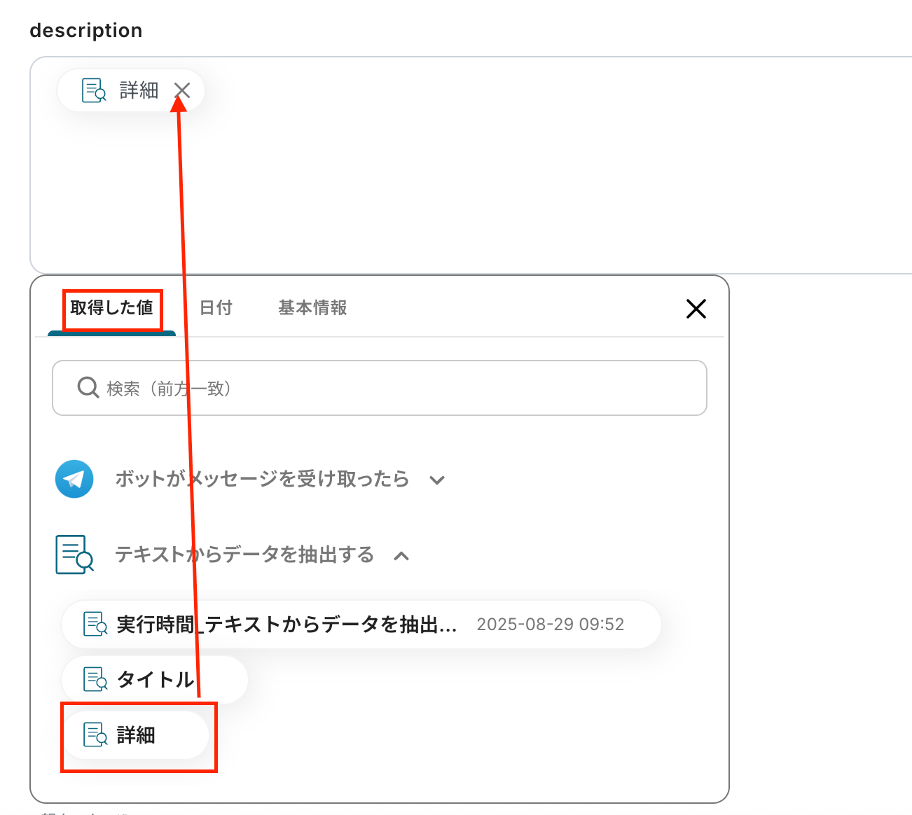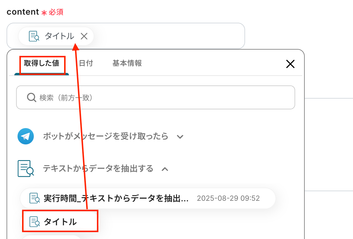 抽出したい項目は、次のTodoistに追加したい値を設定しましょう。
