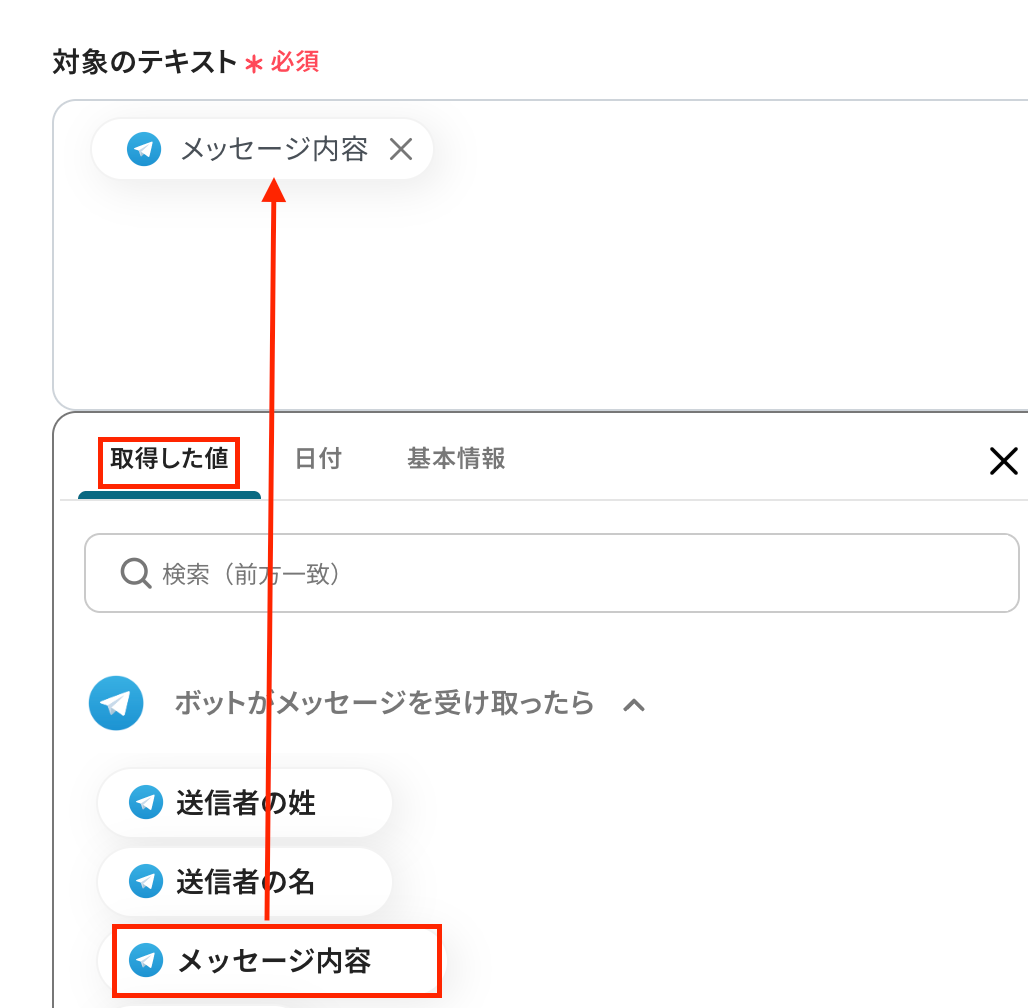 対象のテキストは、Todoistで取得した値から「メッセージ内容」を選択します。