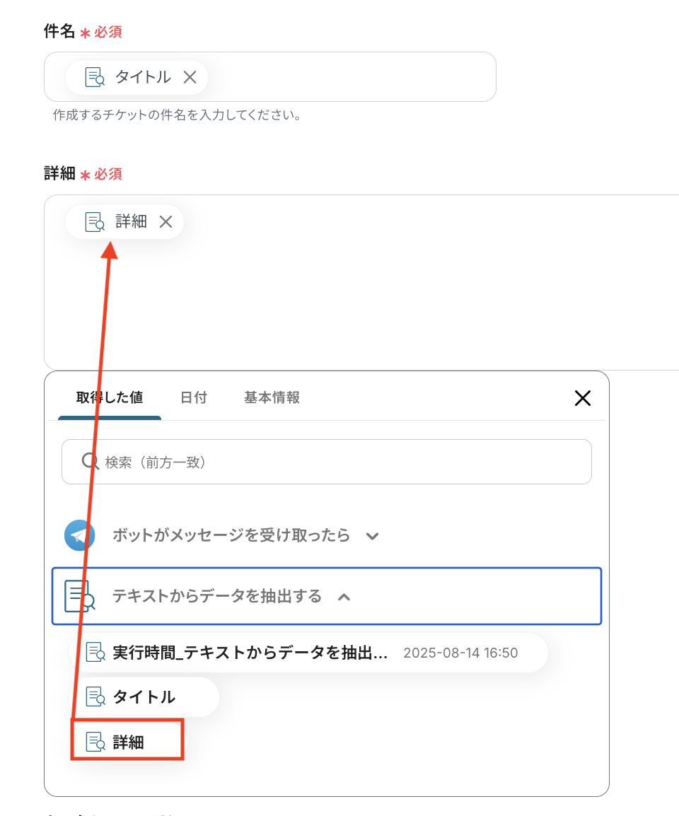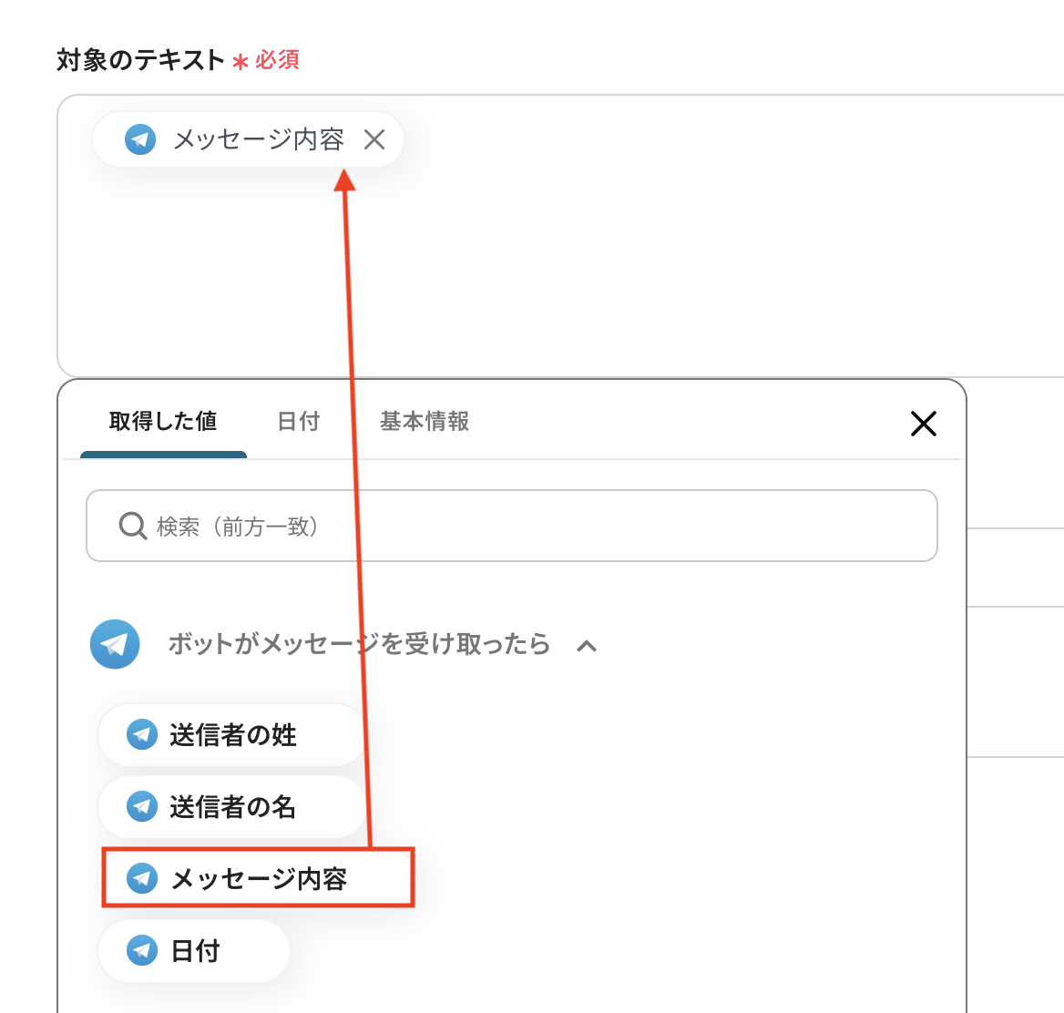 入力欄をクリックすると、前のステップでTelegramから取得済みのアウトプットが表示されるので、選択して入力しましょう。
