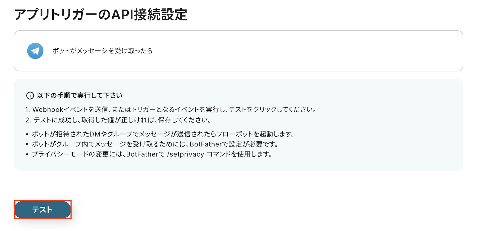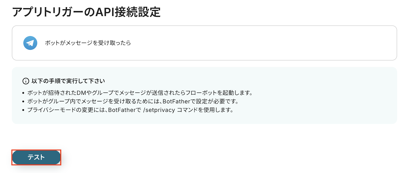 TelegramとYoomのWebhook接続が問題なければ、「テスト成功」のメッセージが表示されます。