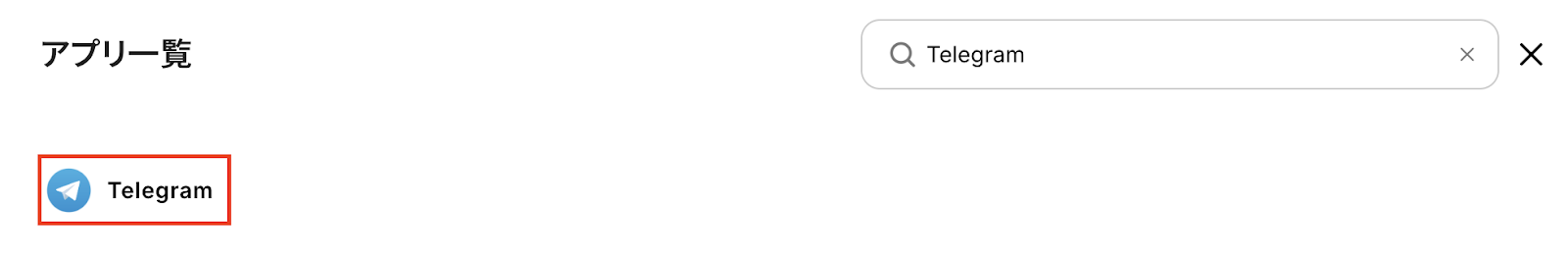 新規接続をクリックしたあと、アプリのメニュー一覧が表示されるのでTelegramと検索し対象アプリをクリックしてください。