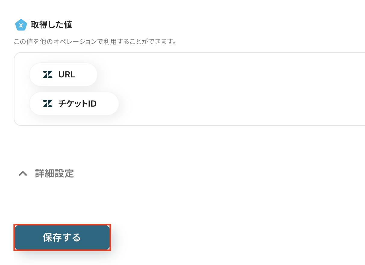 Zendeskの「チケットを作成」アクションでは、件名や詳細に加えて、担当のエージェントID・優先度・タイプ・カスタムフィールドなども設定できます。