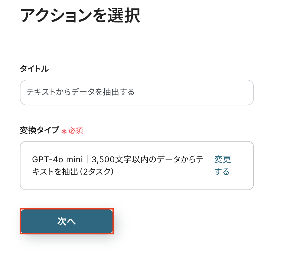 変換タイプ(GPT-4o mini|3,500文字以内のデータからテキストを抽出(2タスク))がデフォルトで設定されているので、確認し「次へ」をクリックします。