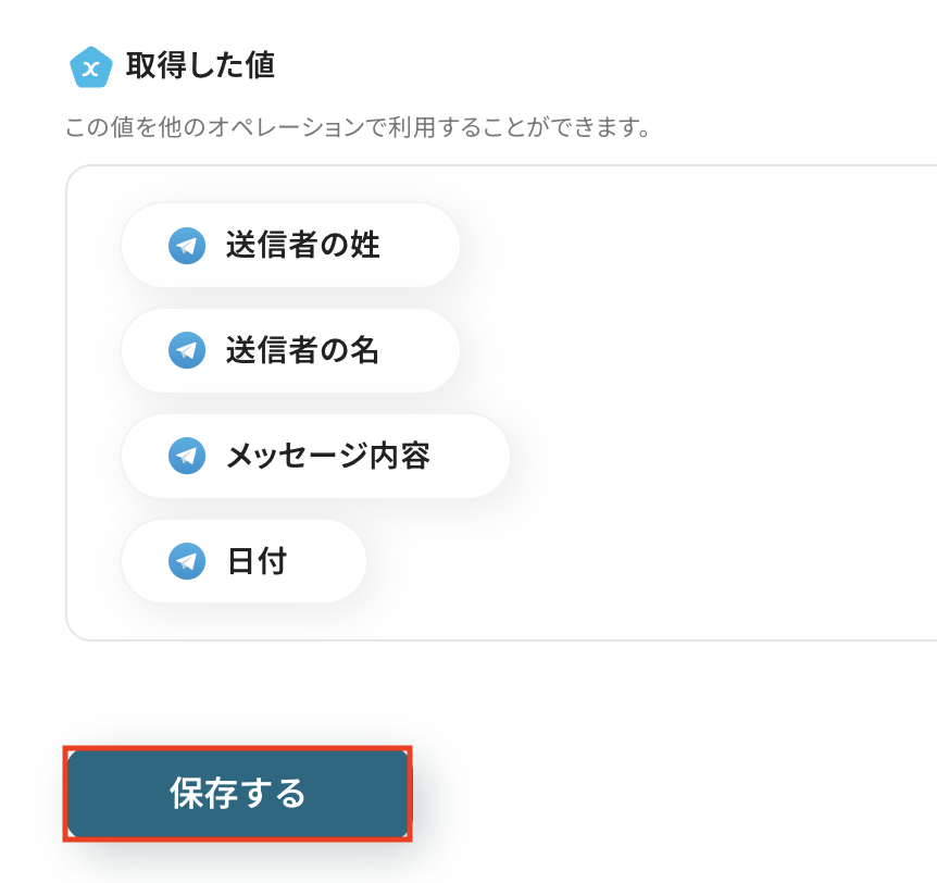 これらの入力欄には、固定値を直接指定することも、Telegramの投稿から抽出したアウトプットを割り当てることも可能です。