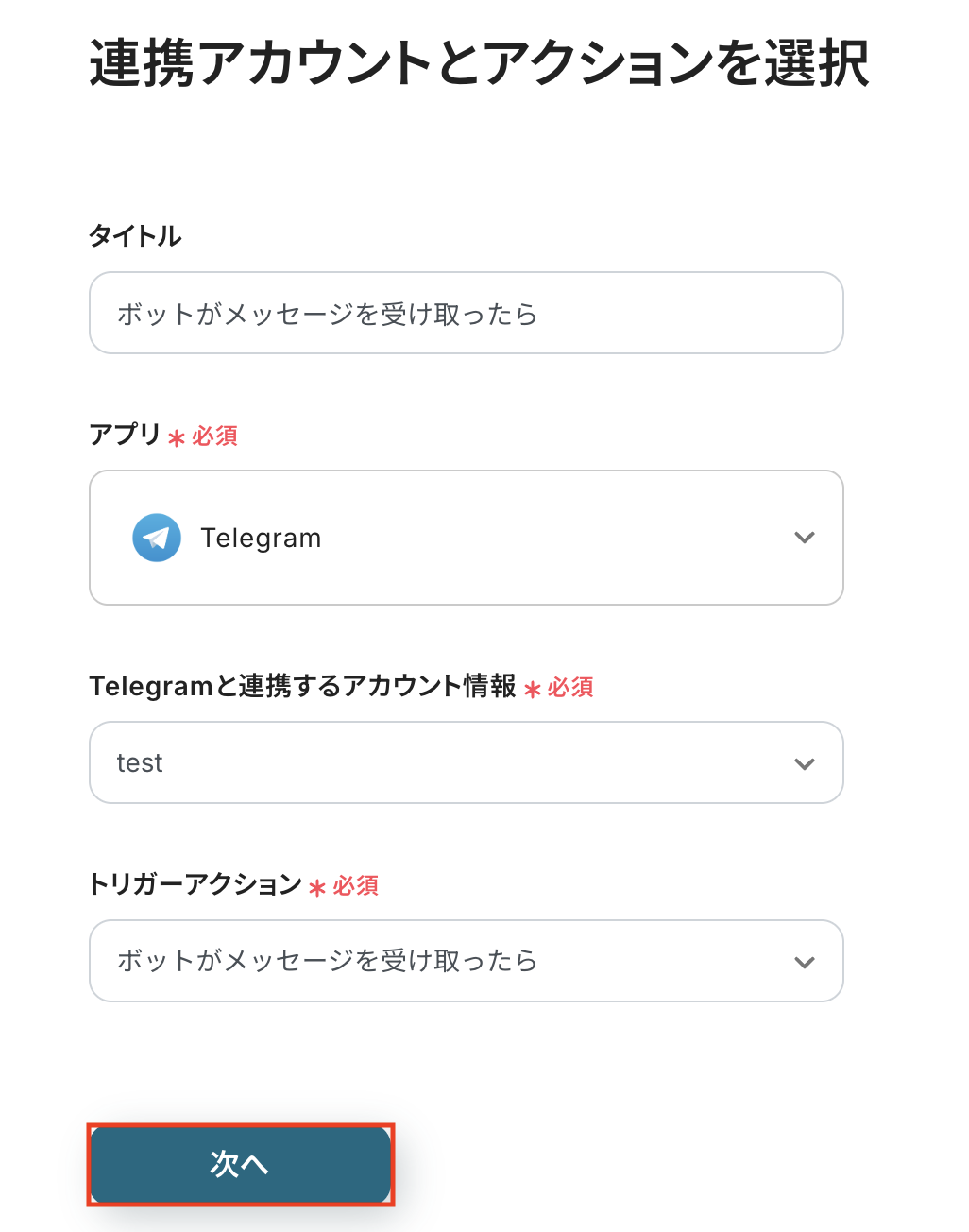 Telegramと連携するアカウント情報に問題がなければ、「次へ」をクリックします。