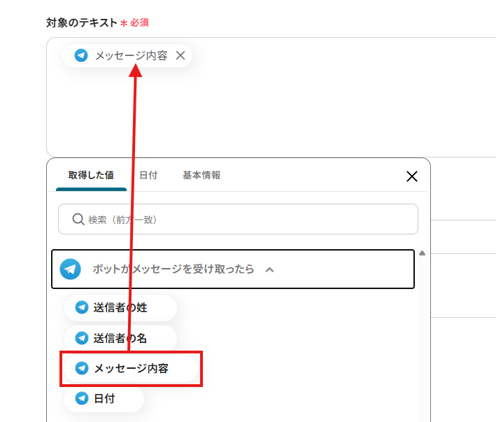 「対象のテキスト」は、入力欄をクリックして表示される取得した値から選択してください。
