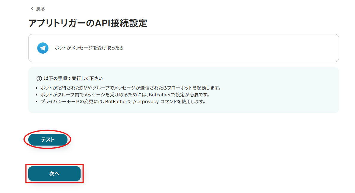4.次の画面に進んだら、Telegramの画面で、今回の設定のトリガーとなる操作を実行します。