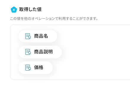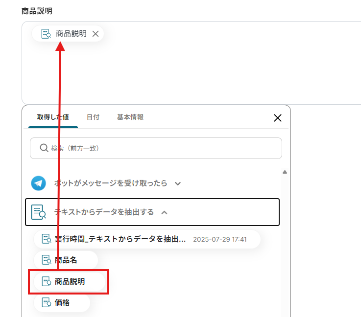 「商品説明」は、入力欄をクリックして表示される取得した値から選択してください。
