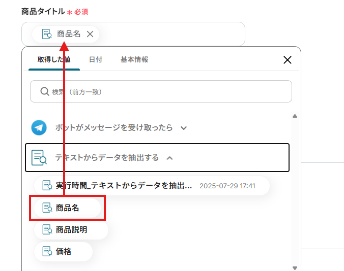 「商品タイトル」は、入力欄をクリックして表示される取得した値から選択してください。