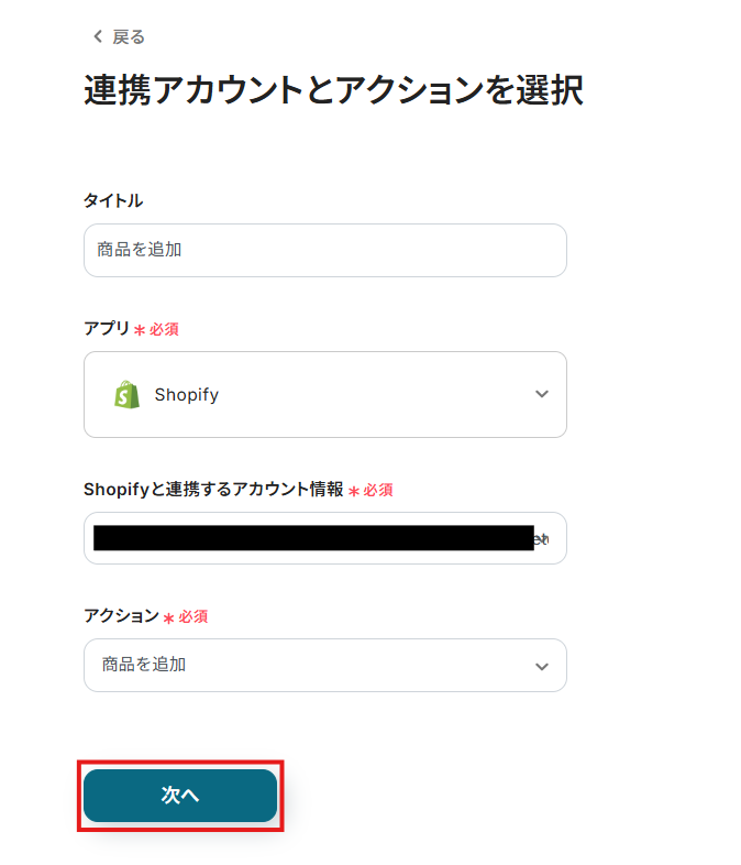 連携するアカウント情報には、ステップ1で連携したアカウント情報が反映されています。トリガーアクションはそのままにして、「次へ」をクリックしてください。