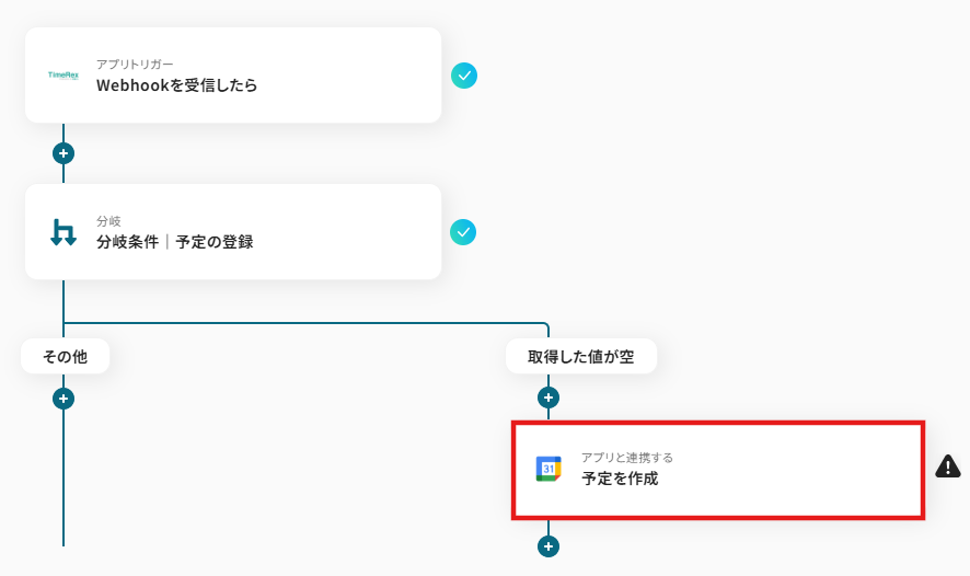 TimeRexに新しい予定が登録されるたびに、その情報を自動でGoogleカレンダーにも登録することで、手動での二重入力の手間をなくし、カレンダーへの反映漏れや入力ミスを防ぎます。この連携は、分岐などのコマンドオペレーションを含むパターンで実現できます。