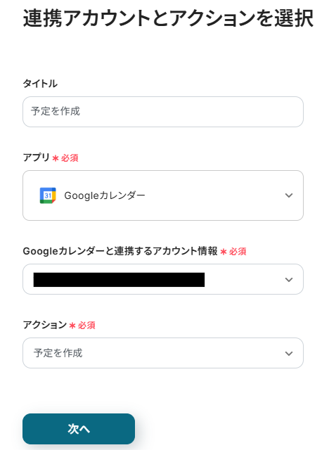 先ほどと同様にタイトルと連携するアカウント情報を任意で設定し、アクションはテンプレート通りに「予定を作成」のまま、下にスクロールしましょう。