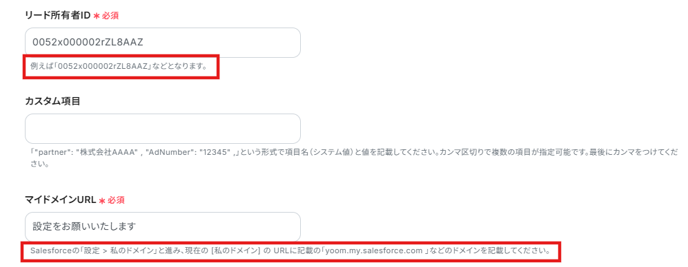 4.その他の項目を任意で設定した後に、リード所有者IDとマイドメインURLは、枠外の注釈を参考に設定してください。
