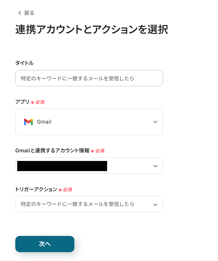 「連携アカウントとアクションを選択」画面では以下を設定します。