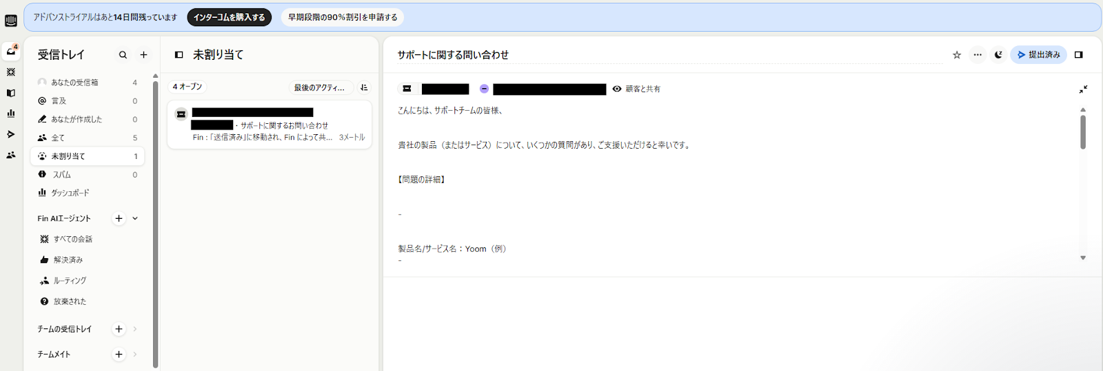 Intercomにもチケットが作成されていることが確認できます。