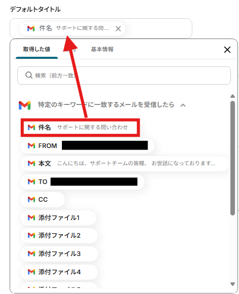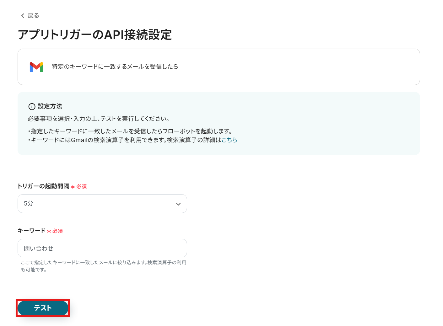 また、設定のテストで使用するため、指定したキーワードが書かれたメールをGmailで受信しておいてください。