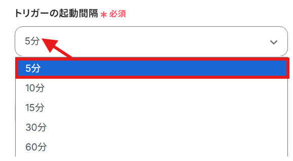 ・トリガーは5分、10分、15分、30分、60分の間隔で起動間隔を選択できます。