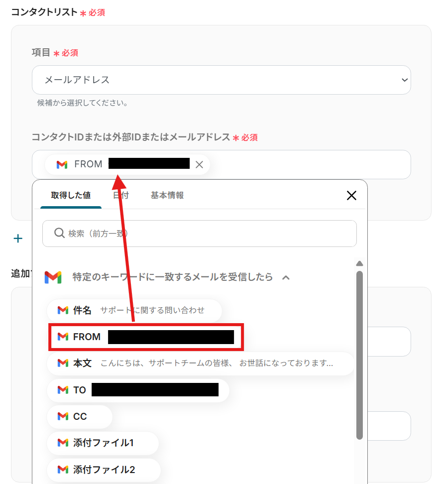 コンタクトIDまたは外部IDまたはメールアドレスが設定されていない場合は、プルダウンより「FROM」の値を設定してください。