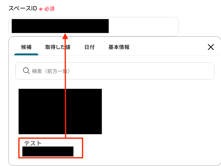 スペースIDを選択します。対象スペース(例:テストスペース)を指定します。