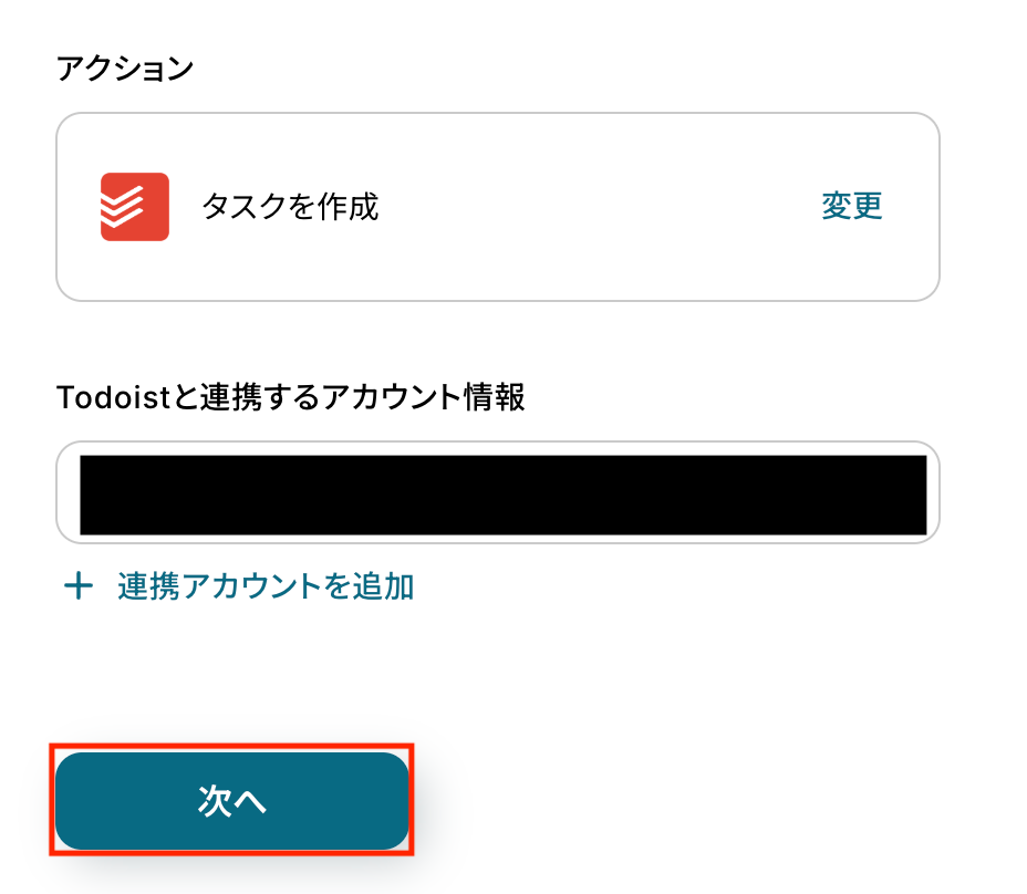 連携するTodoistアカウントを選択し、「次へ」をクリックします。