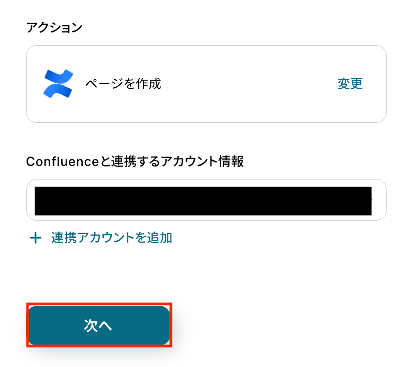 連携するConfluenceアカウントを選択し、「次へ」をクリックします。