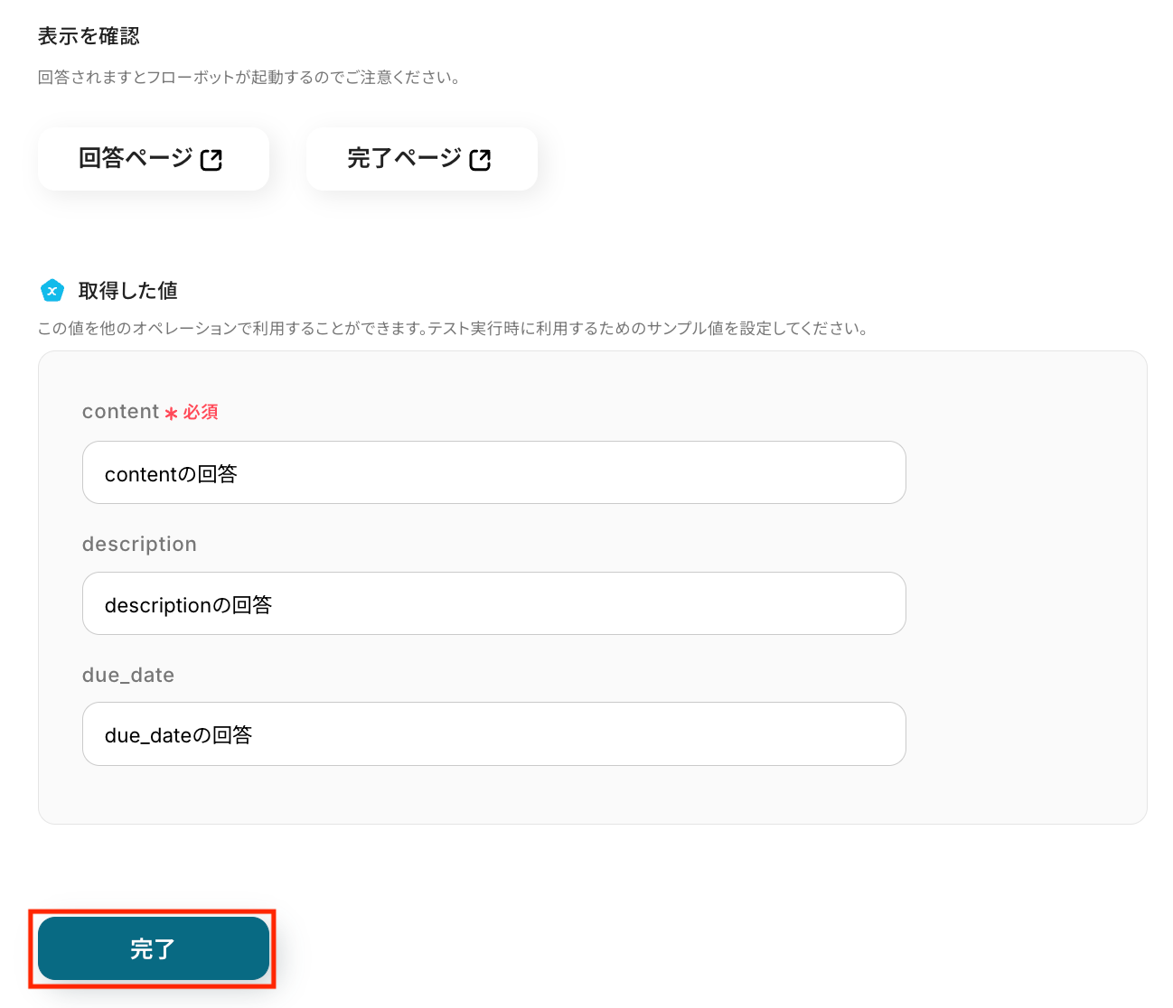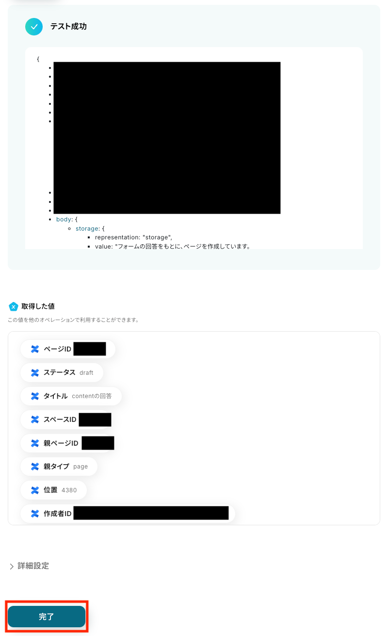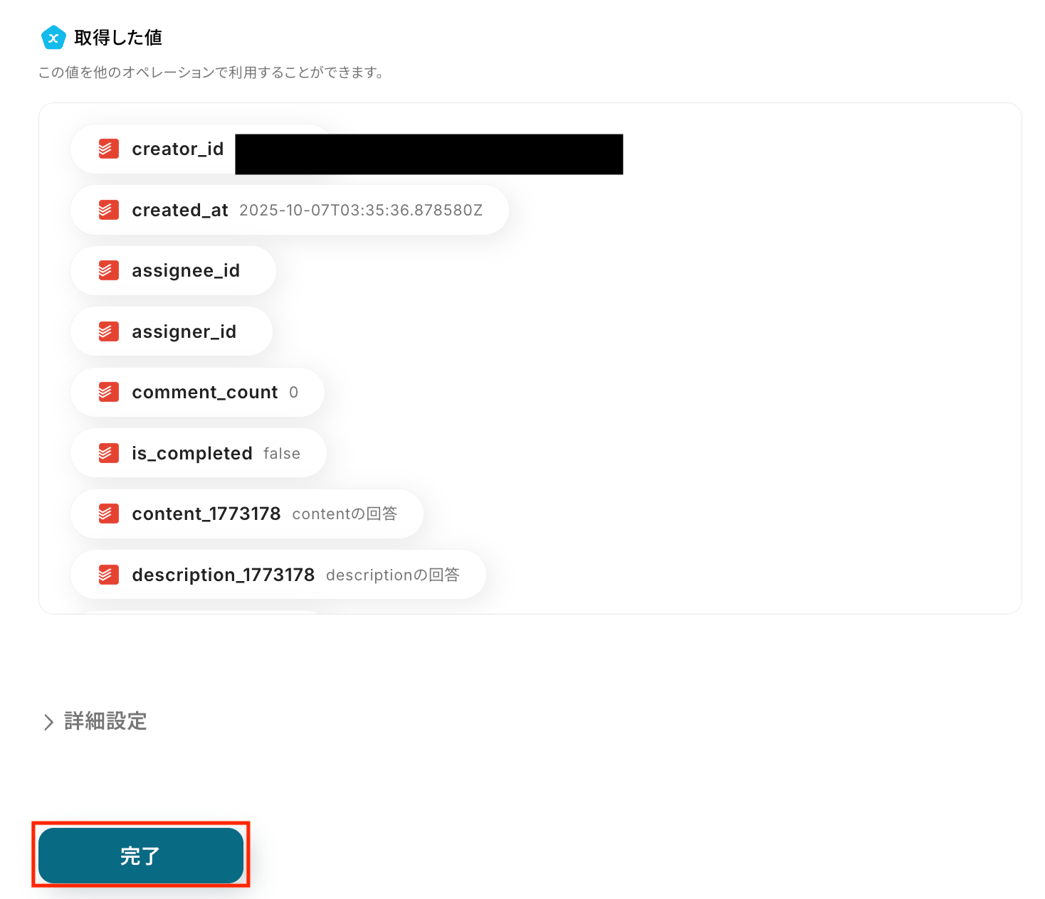 取得した値を確認し、「完了」をクリックします。