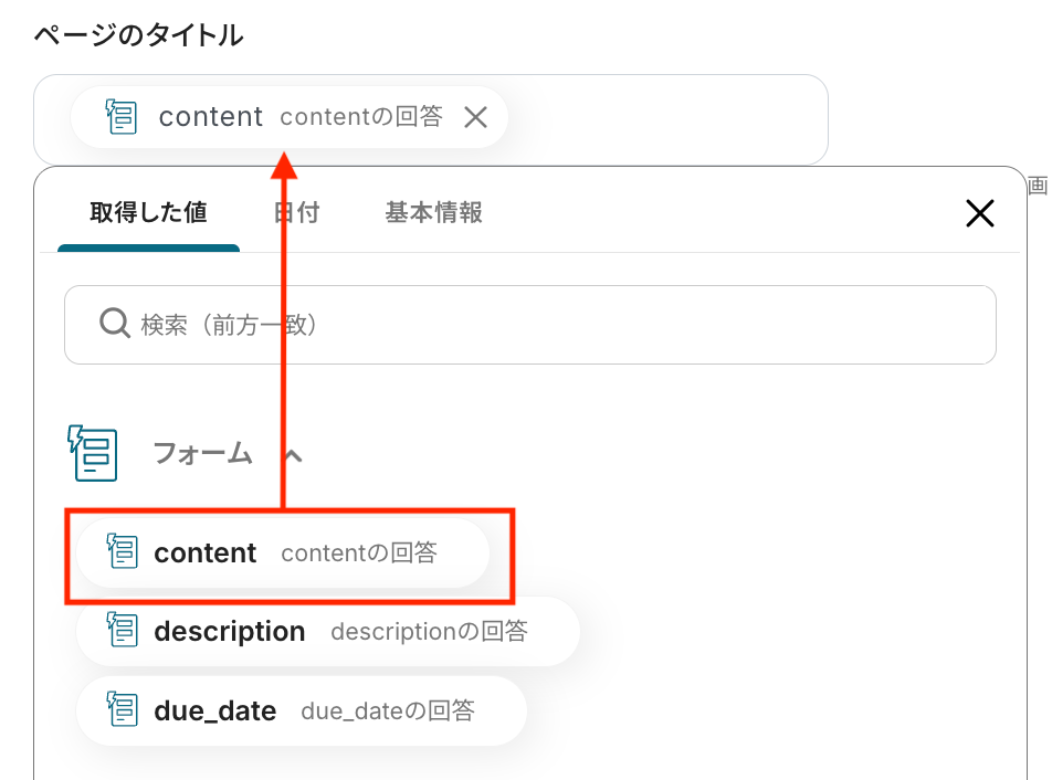 ページタイトルにフォームの「content」をマッピングします。
