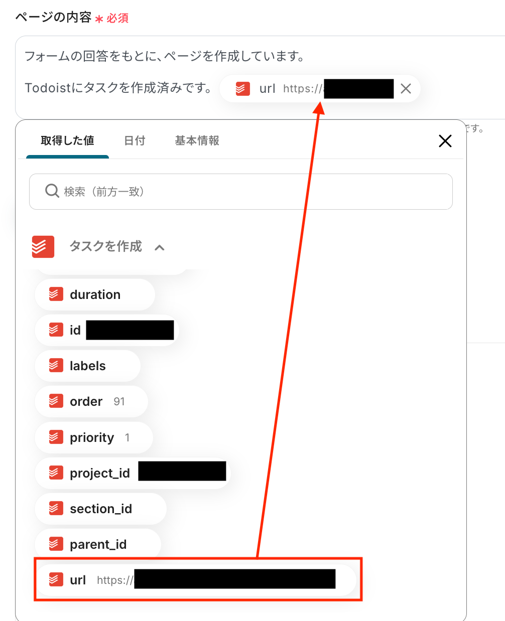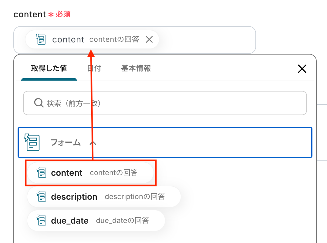 フォームで入力した「content」フィールドを取得した値から、Todoistのタスク内容にマッピングします。