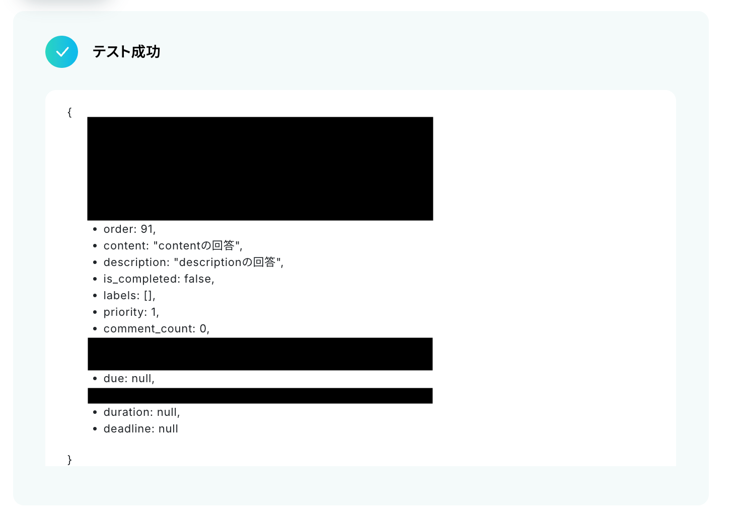 取得したタスクの値(content、description、is_completed など)を確認します。
