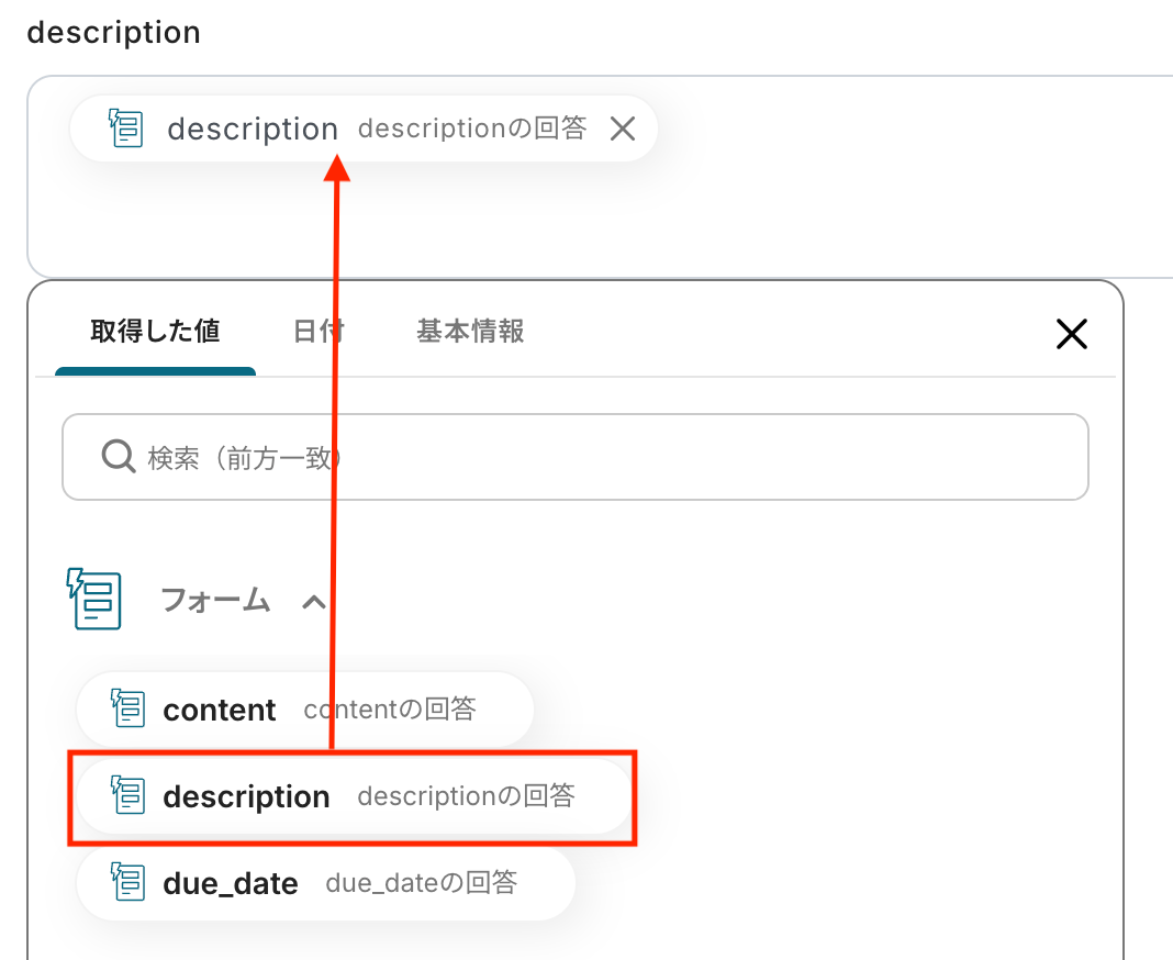 フォームの「description」を、フォームのデータからマッピングします。