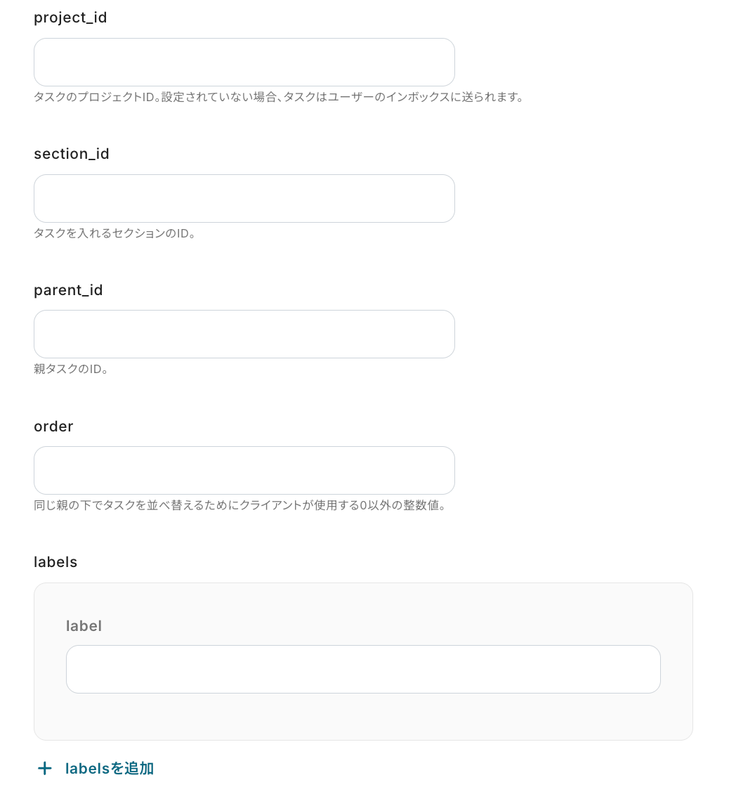 タスクの詳細項目(project_id、priority、due_date など)を注釈に沿って設定します。