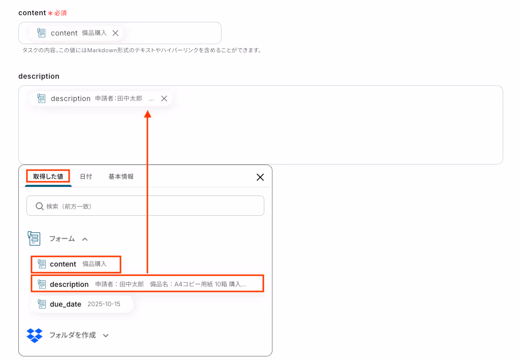 「content(タスク名)」「description(タスクの詳細)」を、取得した値から選択します。