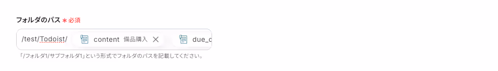 A:はい、可能です。「フォルダを作成」のオペレーションで、「フォルダのパス」にcontentとdue_dateを取得した値から選択すると、「タスク名_YYYYMMDD」のように、命名規則を設定できます。