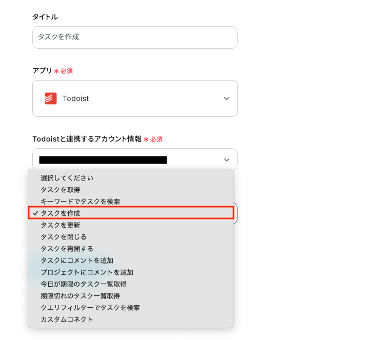 フォームのトリガーをもとに、Todoistでタスクを作成するための設定をします。