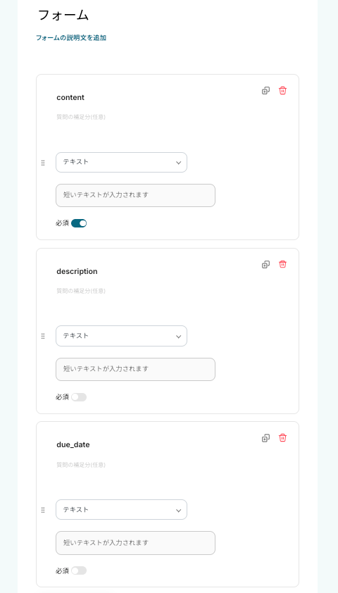 「content(タスク名)」「description(タスクの詳細)」「due_date(タスクの期限)」のサンプルを手動で入力し、「保存する」をクリックして、次に進みましょう!