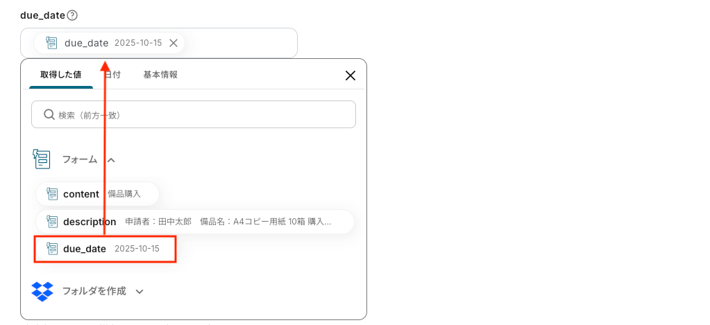同様に、「due_date(タスクの期限)」も取得した値から選択してください。