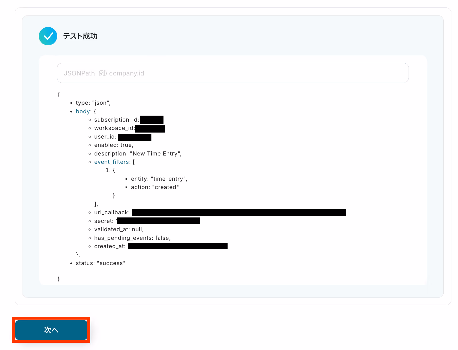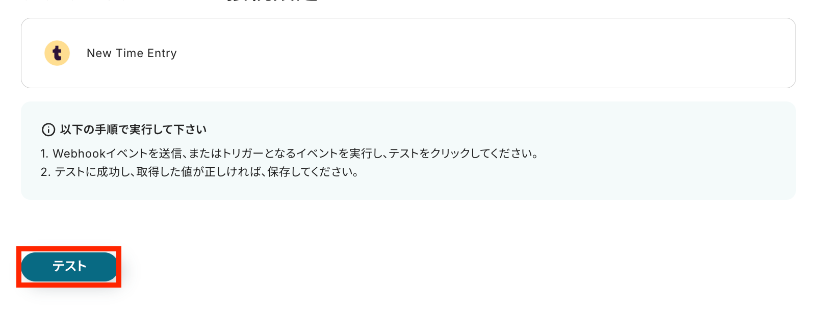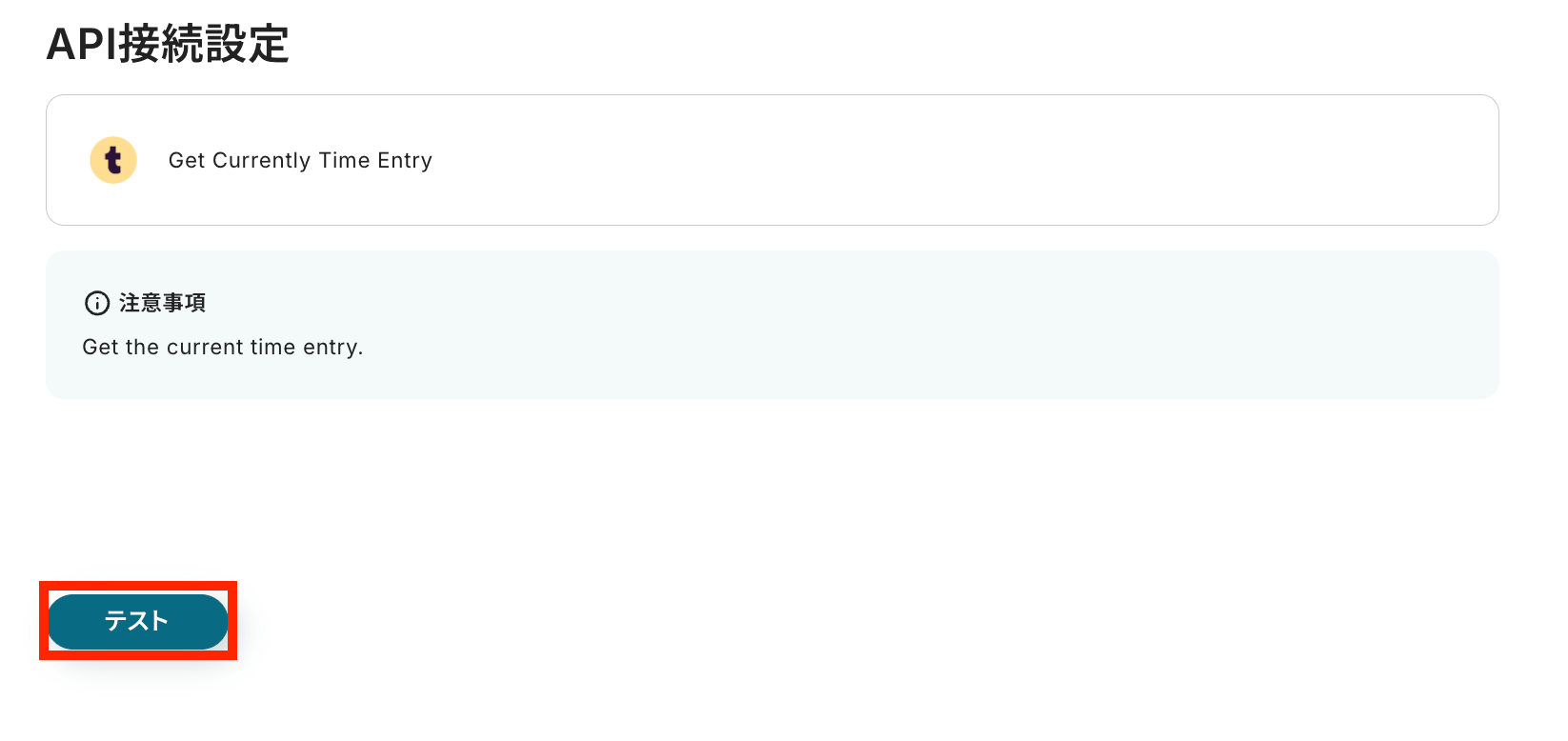 今のTime Entryの情報を取得します。テストボタンをクリックしましょう。