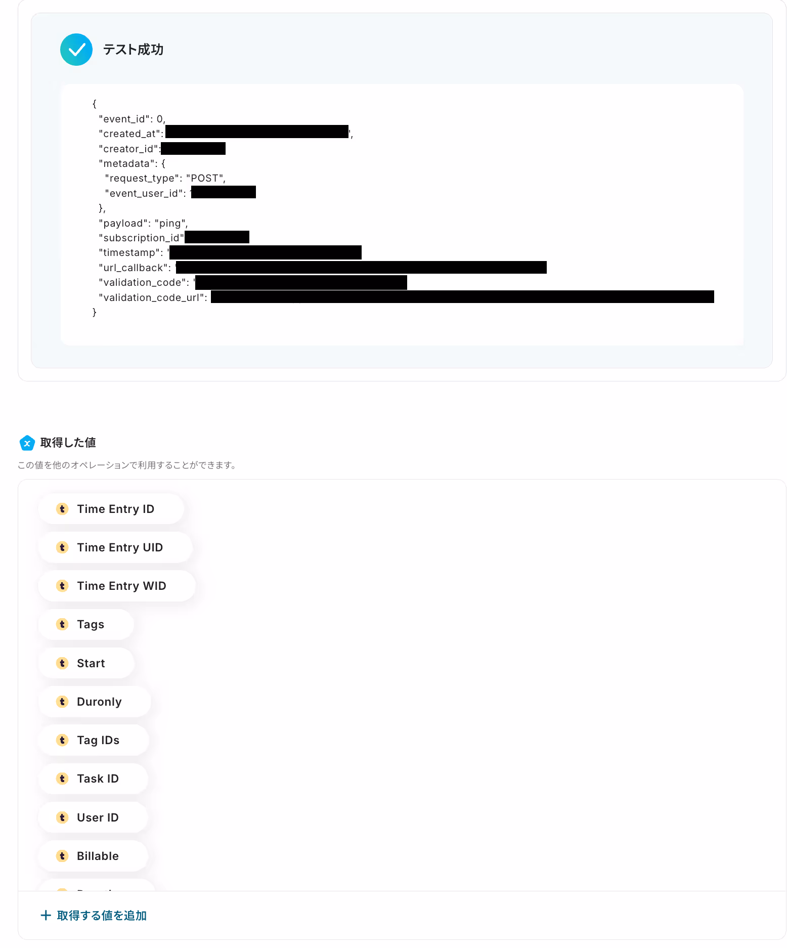 「テスト成功」と表示が出たら、同じく取得した値にデータが反映されます。