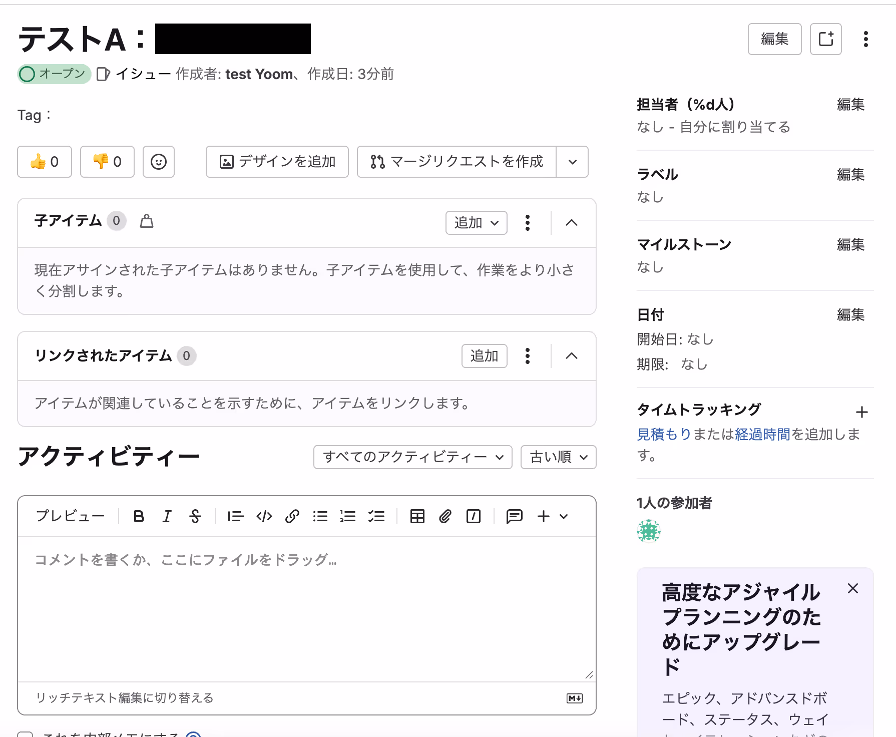 テスト成功という表示がされたら、GitLabにてイシューが作成されています。