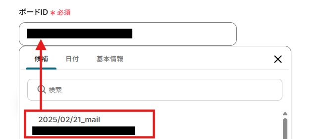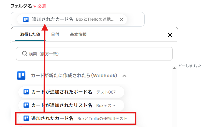 フォルダ名は以下のようにTrelloの取得した値から「カード名」をクリックし、フォルダ名に設定しましょう。