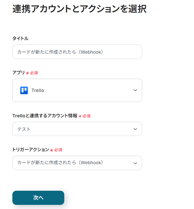 連携アカウントとアクションを選択する画面が表示されるので、今回連携するTrelloのアカウントを確認し「次へ」をクリックします。