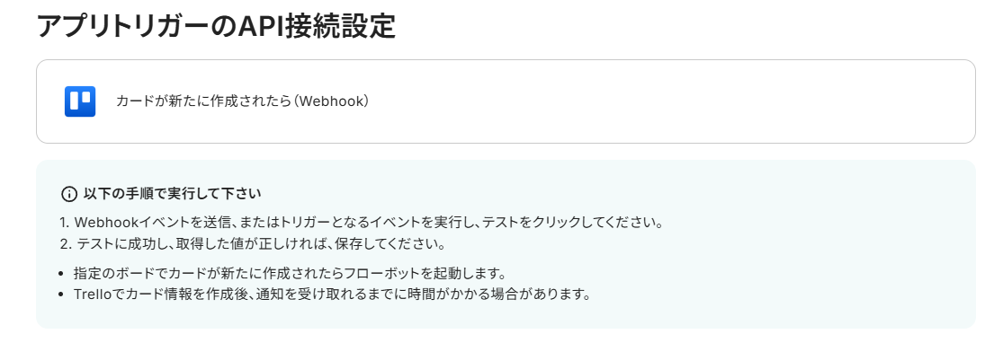 Trelloで新しいカードが作成されたことを自動化のトリガーにするための設定を行います。
